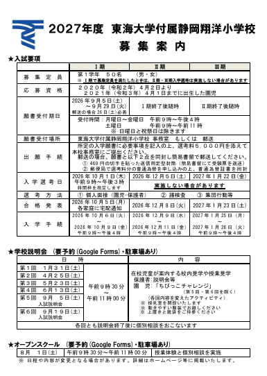 【学校説明会】と【オープンスクール】の2本立てで、皆さまのご参加をお待ちしております。下の募集案内をご覧ください。詳細は、ホームページにてお知らせしますので、定期的にチェックしてください。