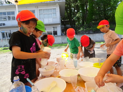 「夏のどっかんこ」をしました!登園してくる子ども達はグラウンドを見て「なに?なに?」と興味津々!どろんこがあったり絵の具があったり、魅力的なものがいっぱい!どの遊びも夢中になって遊んでいました!