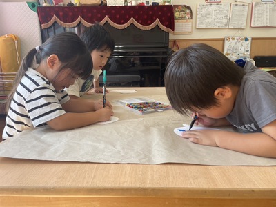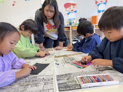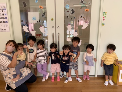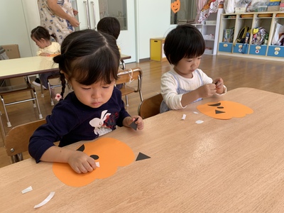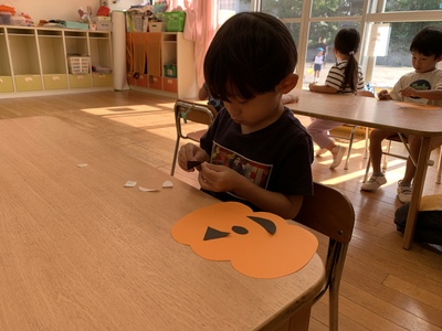 ハロウィン制作をしました!「どんな顔にしようかな?」と考えながら作っていた子ども達♪ できあがった おばけを飾ると大喜びしていました!