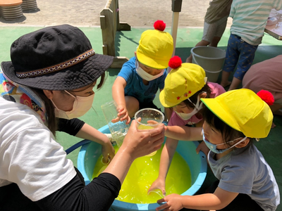 色水で遊びました!たくさんの色の色水を作ってジュース屋さんが開店☆友達や先生に「どうぞ!」と渡していた子ども達!いろんなジュースができ、大盛り上がりでした!