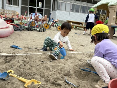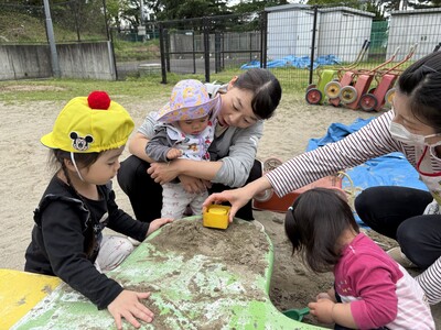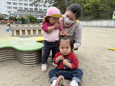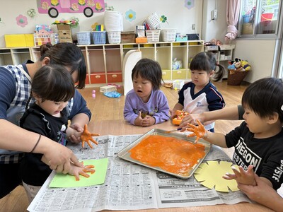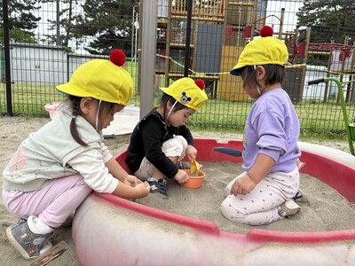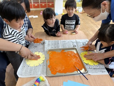 つくし組、たんぽぽ組の生活に少しずつ慣れてきて好きな遊びを楽しんでいます。外遊びでは、新しいおもちゃや砂遊びが人気です♪先生の作った型抜きを壊したり、その砂を集めて何度も楽しみました!教室では、初めて絵の具を使って制作をしました。これから、いろいろな制作を楽しんでいきましょう!