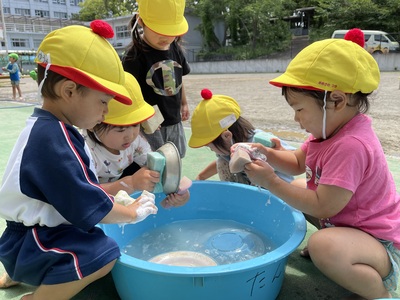 戸外で水遊びを楽しみました!水の感触を楽しみながら気持ち良さそうに遊んでいました!制作ではちぎった折り紙を貼り「喜んでくれるといいね!」と、大好きな人を思い浮かべながら、楽しそうに取り組んでいました!