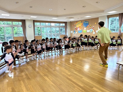 英語教室がありました!英語の絵本に興味津々の子ども達!みんなの大好きな絵本になりました!教室では虫のダンスやジェスチャーゲームをして、体を動かして楽しみました!
