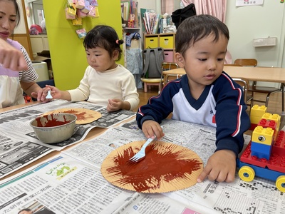 栗の制作をしました!綿棒で模様をスタンプしたり、イガはフォークを使って表現しました!「大きな栗の木の下で~♫」と、歌を口ずさみながら楽しんで取り組んでいました!