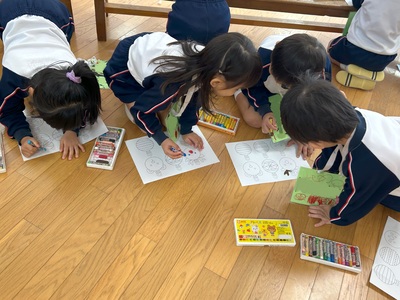 英語教室がありました!絵本を見たり、クリスマスのお話を聞いたりした後にぬりえに挑戦!「カラフルにしよう」とていねいに塗っていました!