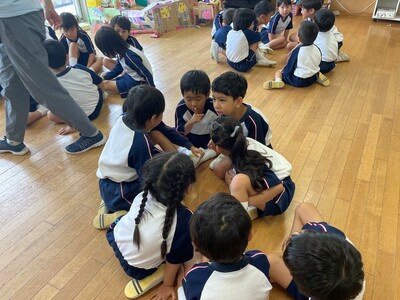 ふじ組とほし組で一緒にゲームをしました!サマーキャンプのグループで答えを考える「連想ゲーム」をしました!みんなで意見を出し合い、正解したら大喜びの子ども達でした!